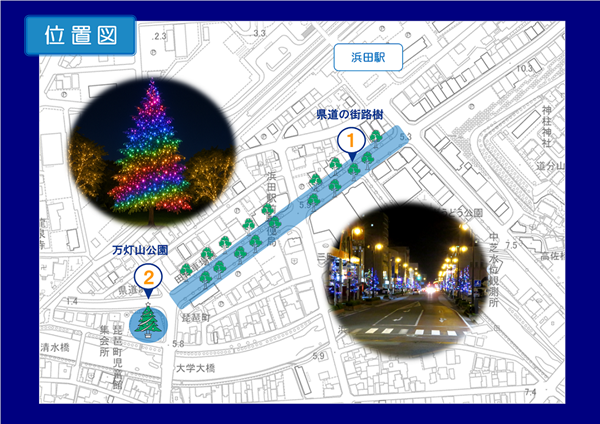 JR浜田駅から万灯山公園までの約500mを彩る毎年恒例のイルミネーション。