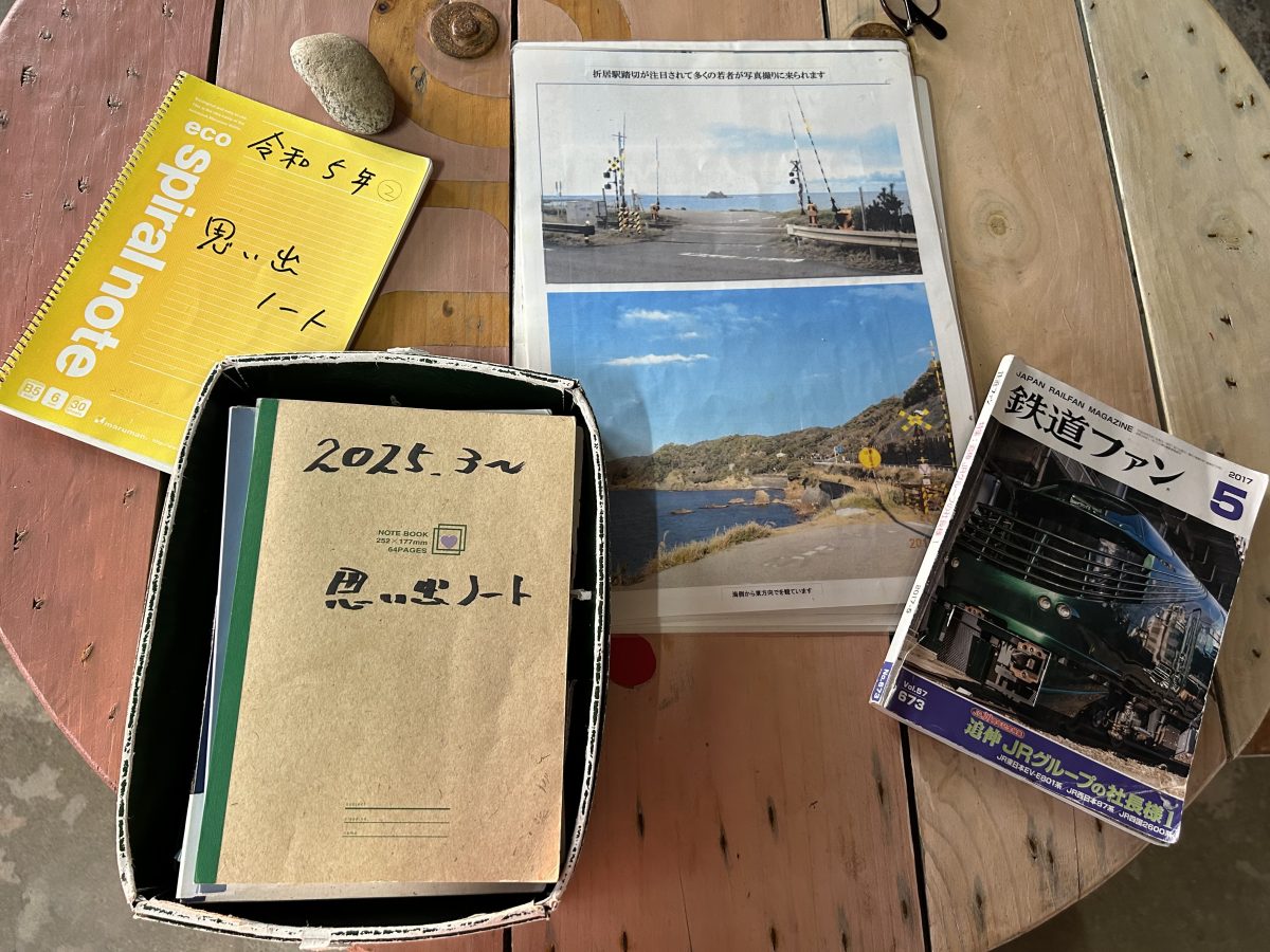 木製の丸テーブルには、思い出ノートや雑誌『鉄道ファン』が置かれています。