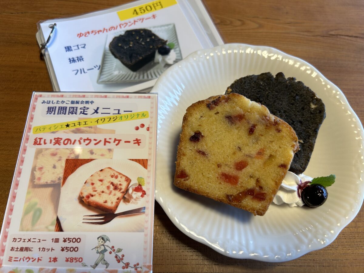今回は、通常メニューの黒ごま味とみはしたかこ個展会期中の期間限定メニューの「紅い実のパウンドケーキ」を頂きました。